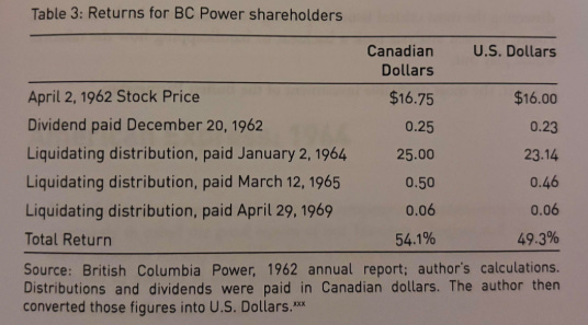 An investor who had bought shares around April 1962 at roughly C$16–17 received a sequence of cash flows that added up to a very respectable outcome: a modest dividend in late 1962, followed by a large liquidating distribution in early 1964, and smaller residual payments in the years that followed. In total, the investment generated a return of just over 50% in Canadian dollars, and just under that in U.S. dollar terms.