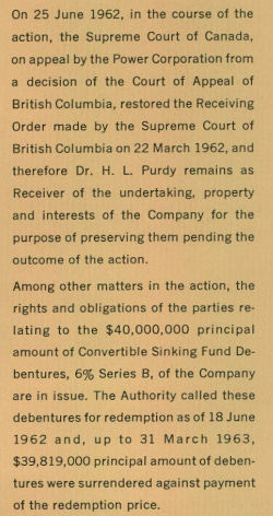 In practice, this risk was far smaller than it appeared. First, the provincial government explicitly assumed responsibility for the debenture debt as part of the expropriation, making it clear that the liability no longer sat with British Columbia Power. Second, the issue largely resolved itself after the passage of the Amending Act, when the British Columbia Hydro and Power Authority called the debentures in May 1962.